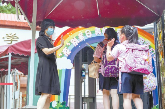 昨天早晨,豐臺(tái)區(qū)芳古園小學(xué),因疫情闊別校園多日的小學(xué)生返校復(fù)課,老師在校門口歡迎孩子們歸來。本報(bào)記者 鄧偉攝
