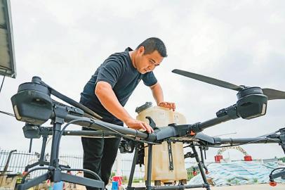 中江縣金穗源糧食專業(yè)合作社理事長常滔在做無人機起飛前的準(zhǔn)備工作。四川日報全媒體記者 李強 攝