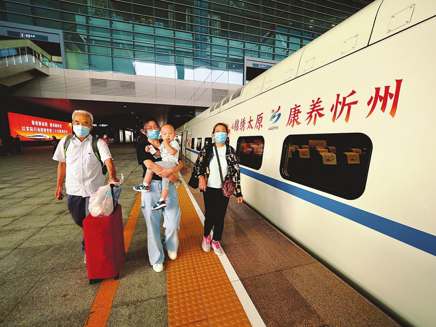 服務(wù)于“太忻號”的乘務(wù)員深感責(zé)任在肩?!拔覀兝密嚿碣N、海報等對車體進(jìn)行立體式包裝——雙塔寺、五臺山大白塔、忻州古城……動車組似一道絢麗的彩虹把兩地的山山水水串聯(lián)起來,實現(xiàn)‘錦繡太原、康養(yǎng)忻州’旅游元素的共享。我們還為旅客提供忻州美食,做好服務(wù)員、宣傳員、導(dǎo)游員,讓旅客了解忻州文化、山西文化,打響‘太忻號’品牌,助推旅游業(yè)發(fā)展?!薄疤锰枴绷熊囬L王芳如是說。