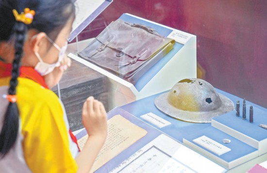 昨天,在中國(guó)人民抗日戰(zhàn)爭(zhēng)紀(jì)念館,《烽火印記——北京抗日戰(zhàn)爭(zhēng)主題片區(qū)特展》展廳內(nèi),參觀者在第29軍戰(zhàn)士的鋼盔前駐足。本報(bào)記者 武亦彬攝