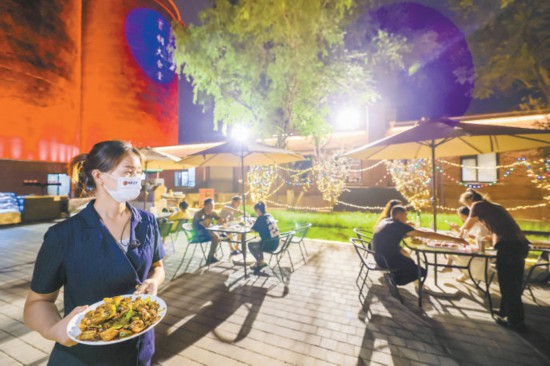 在廠東門(mén)廣場(chǎng)附近,人氣餐廳首鋼大食堂背后的巨大筒倉(cāng)被紅色燈光照亮。董先生一家掃碼測(cè)溫后直接落座戶(hù)外用餐區(qū),點(diǎn)了烤串和麻辣小龍蝦,孩子還特意點(diǎn)了瓶首鋼汽水?!霸谶@些鋼鐵大家伙的圍繞中擼串兒,全北京就這一家!”董先生說(shuō)。