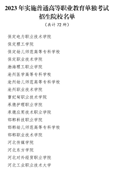 人民網(wǎng)石家莊12月3日電 (楊文娟)近日,河北省教育廳印發(fā)了關于做好2023年普通高等職業(yè)教育單獨考試招生工作的通知。通知明確,2023年高職單招采取統(tǒng)考計劃和對口計劃分開編列的方式進行,河北實施高職單招院校共計72所。
