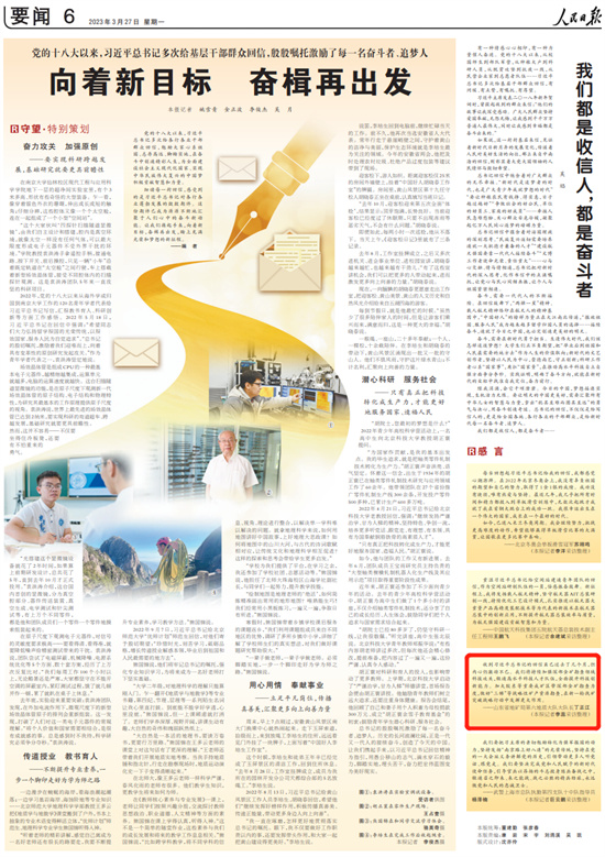 細(xì)讀每一封回信,感受到的是習(xí)近平總書記對各行各業(yè)蓬勃發(fā)展的殷殷期許。這份期許已成為源源不斷地匯聚于人們心中的奮斗新動能。讓我們攜起手來,向著新目標(biāo),奮楫再出發(fā),踏上充滿光榮和夢想的新征程。