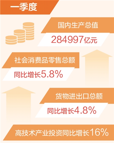 國內(nèi)需求逐步擴(kuò)大。一季度,社會(huì)消費(fèi)品零售總額同比增長5.8%,服務(wù)零售額保持兩位數(shù)增長。一季度,固定資產(chǎn)投資同比增長5.1%,與上年全年持平。