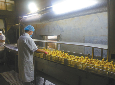 從孵化到養(yǎng)殖,從飼料到屠宰,榮達公司每個環(huán)節(jié)都嚴格控制,著力打造高質量鴨肉品牌?!耙屜M者吃得營養(yǎng)、吃得健康?!迸V峰說。在優(yōu)質肉鴨新品種培育方面,榮達公司建成了標準化育種場,主要用于優(yōu)質雙黑白羽肉鴨選育,實現(xiàn)孵化場——養(yǎng)殖戶——屠宰廠——飼料廠產(chǎn)業(yè)鏈運作經(jīng)營模式,各個環(huán)節(jié)協(xié)同推進。