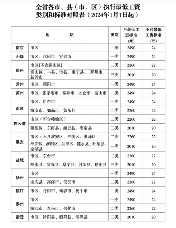 通知顯示,根據(jù)《最低工資規(guī)定》(原勞動(dòng)保障部令第21號)和《江蘇省工資支付條例》規(guī)定,經(jīng)省人民政府同意,從2024年1月1日起調(diào)整全省最低工資標(biāo)準(zhǔn)。調(diào)整后,全省月最低工資標(biāo)準(zhǔn)為:南京、蘇州、無錫、常州、鎮(zhèn)江五市及南通市區(qū)、揚(yáng)州市區(qū)、泰州市區(qū)等一類地區(qū)2490元;徐州市區(qū)(不含銅山區(qū))、連云港市區(qū)(不含贛榆區(qū))等二類地區(qū)2260元;宿遷全市等三類地區(qū)2010元。非全日制用工小時(shí)最低工資標(biāo)準(zhǔn):一類地區(qū)24元,二類地區(qū)22元,三類地區(qū)20元。
