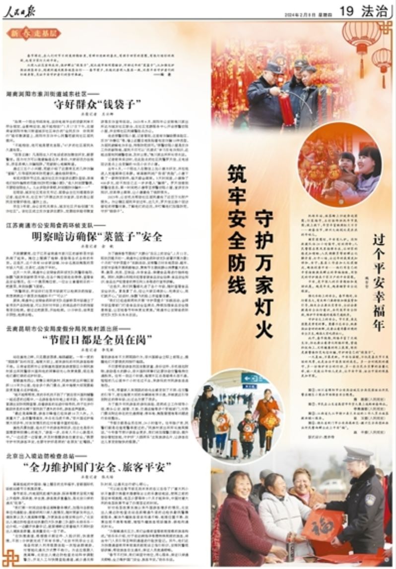 從深入社區(qū)宣傳反詐,保護(hù)群眾“錢袋子”,到扎進(jìn)市場明察暗訪,守好過年的“菜籃子”;從加強(qiáng)巡護(hù)保證游客安全,到便利通關(guān)服務(wù)旅客出行……春節(jié)前夕,本報(bào)記者深入基層一線,記錄平安守護(hù)者們的忙碌身影,見證平安守護(hù)者們的堅(jiān)守奉獻(xiàn)。