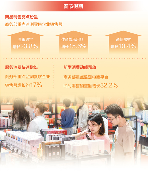 數(shù)據(jù)顯示,春節(jié)假期商品銷售亮點(diǎn)紛呈。春節(jié)假期,節(jié)慶商品、國貨潮品、綠色智能產(chǎn)品等持續(xù)旺銷。商務(wù)部重點(diǎn)監(jiān)測零售企業(yè)金銀珠寶、體育娛樂用品、通信器材銷售額同比分別增長23.8%、15.6%和10.4%。