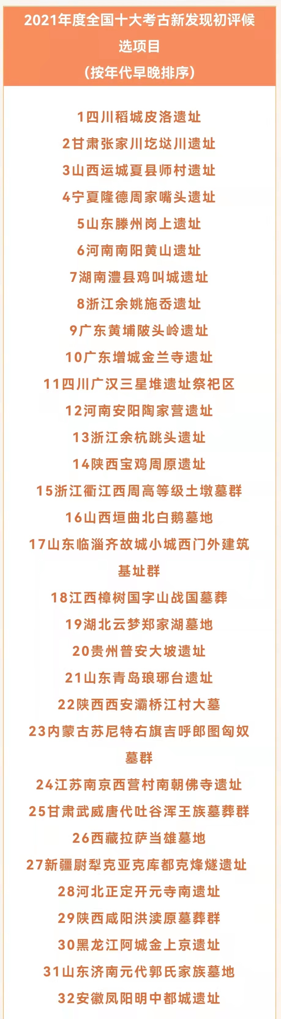 2021年,全國經(jīng)過審批的考古發(fā)掘1700余項。候選項目均為各發(fā)掘資質單位主動申報,經(jīng)國家文物局審核,最終確定32項參評(名單如下)。評選活動辦公室將組織投票推薦產(chǎn)生20項進入終評。