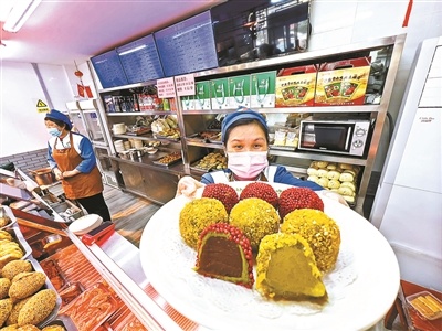 寒食節(jié)有踏青出游、放風(fēng)箏等民俗活動(dòng),護(hù)國寺小吃“寒食十三絕”中的蜜麻花,形似風(fēng)箏,有著寒食吃蜜麻花耳聰目明的寓意;而像姜汁排叉,在春寒尚未退卻之時(shí),以姜汁暖胃,加之春季宜食甜,所以也成為護(hù)國寺小吃寒食中的銷量冠軍。在護(hù)國寺小吃起源店,為了方便市民購買,護(hù)國寺小吃的“寒食十三絕”堅(jiān)持套裝售賣和零售,經(jīng)理王新梅介紹,“像里面的姜汁排叉、蜜麻花的銷量幾乎能占到十三絕銷量的四成左右,最受歡迎?!?/p>