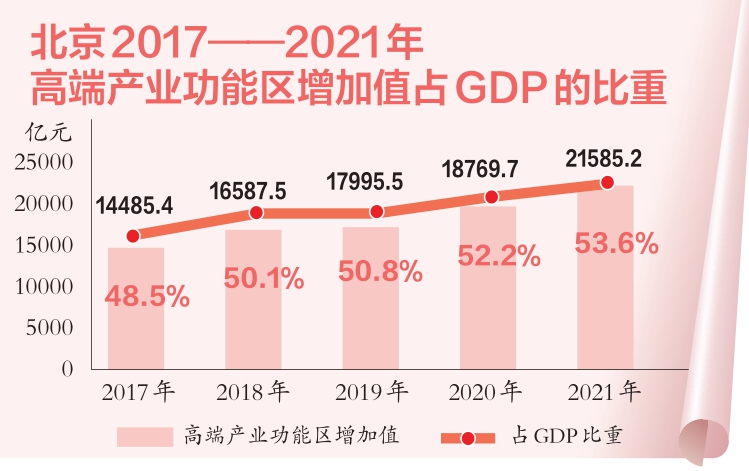 重點(diǎn)功能區(qū)呈現(xiàn)集聚效應(yīng)。中關(guān)村國家自主創(chuàng)新示范區(qū)等高端產(chǎn)業(yè)功能區(qū)占據(jù)全市經(jīng)濟(jì)總量的半壁江山,2021年實(shí)現(xiàn)增加值2.2萬億元,占全市GDP的53.6%,比2016年提高5.3個百分點(diǎn)。