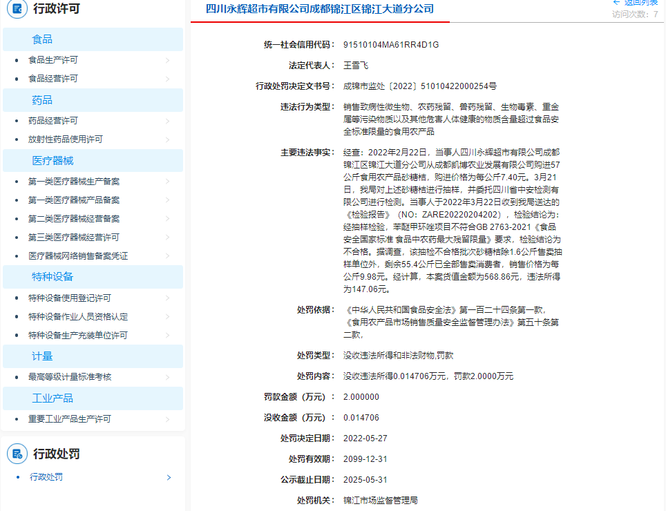 處罰決定文書顯示,經(jīng)查,2022年2月22日,當(dāng)事人四川永輝超市有限公司成都錦江區(qū)錦江大道分公司從成都凱博農(nóng)業(yè)發(fā)展有限公司購(gòu)進(jìn)57公斤食用農(nóng)產(chǎn)品砂糖桔,購(gòu)進(jìn)價(jià)格為每公斤7.40元。當(dāng)事人銷售的砂糖桔經(jīng)抽樣檢驗(yàn),苯醚甲環(huán)唑項(xiàng)目不符合GB 2763-2021《食品安全國(guó)家標(biāo)準(zhǔn) 食品中農(nóng)藥最大殘留限量》要求,檢驗(yàn)結(jié)論為不合格。據(jù)調(diào)查,該抽檢不合格批次砂糖桔除1.6公斤售賣抽樣單位外,剩余55.4公斤已全部售賣消費(fèi)者,銷售價(jià)格為每公斤9.98元。經(jīng)計(jì)算,本案貨值金額為568.86元,違法所得為147.06元。