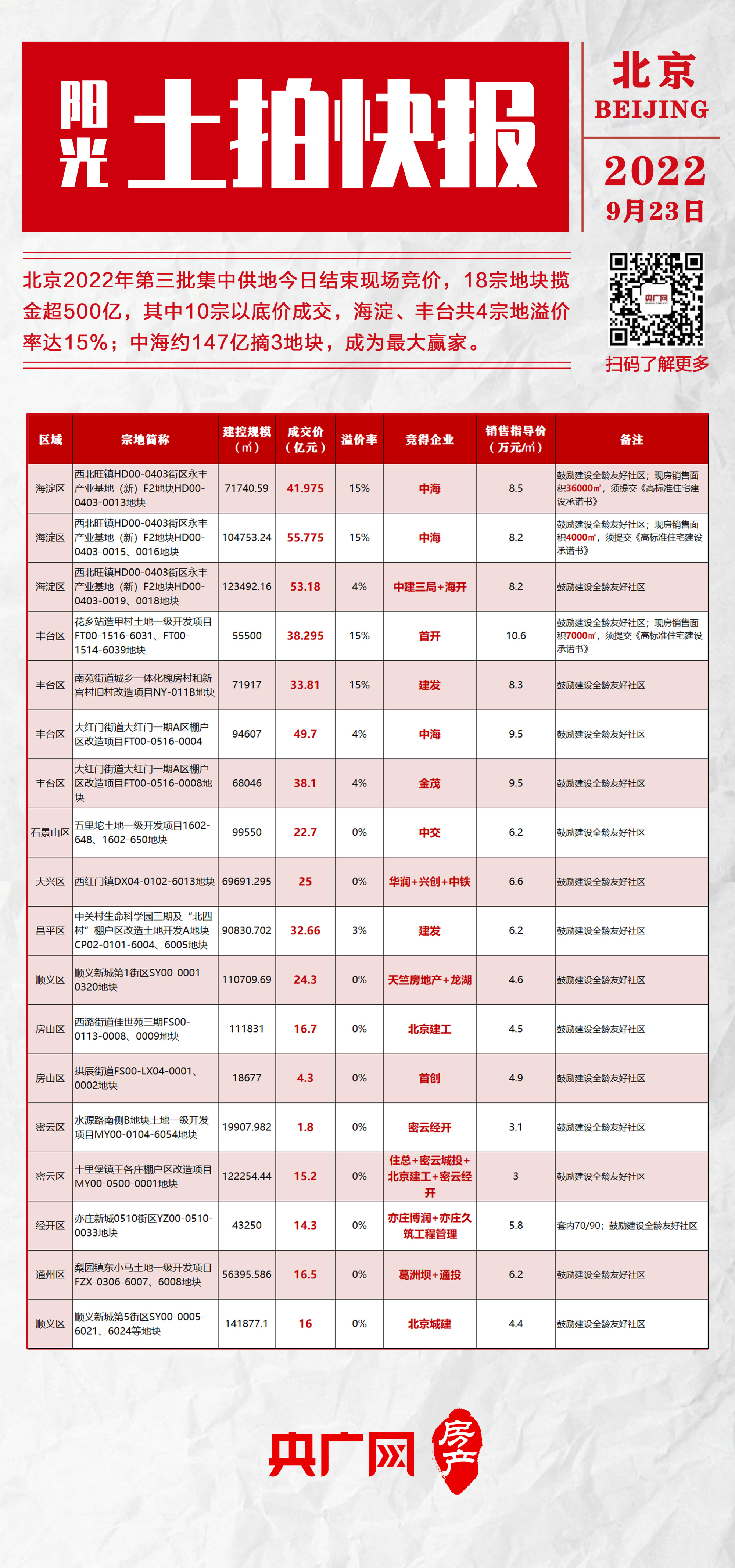 央廣網(wǎng)北京9月23日消息(記者門庭婷)9月23日,北京市2022年第三批集中供地落下帷幕,本次共出讓18宗商品住宅用地,共計(jì)攬金500.295億元,總土地面積約74.8萬(wàn)㎡,總建筑面積約148萬(wàn)㎡。