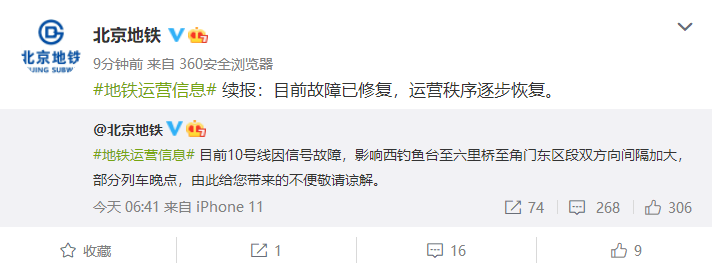 目前故障已修復,運營秩序逐步恢復。