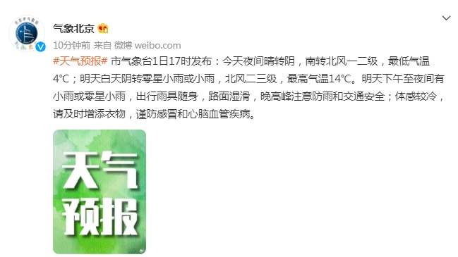 北京市氣象臺(tái)1日17時(shí)發(fā)布:今天(1日)夜間晴轉(zhuǎn)陰,南轉(zhuǎn)北風(fēng)一二級(jí),最低氣溫4℃;明天白天陰轉(zhuǎn)零星小雨或小雨,北風(fēng)二三級(jí),最高氣溫14℃。
