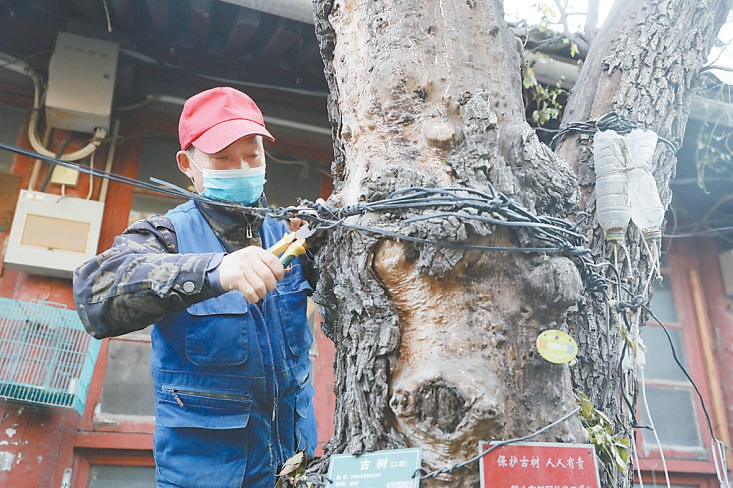 日前,在園林綠化部門、社區(qū)居委會(huì)工作人員的陪同下,東四街道綜合行政執(zhí)法隊(duì)來(lái)到東四六條某平房院。在院落南側(cè)房屋過(guò)道處,一棵樹(shù)齡約110年、掛著二級(jí)保護(hù)標(biāo)牌的棗樹(shù)特別扎眼。古樹(shù)虬曲蒼勁,樹(shù)皮斑駁,在樹(shù)杈處,數(shù)根電線、鐵絲緊緊纏繞著樹(shù)干,由于年代久遠(yuǎn),部分鐵絲已深深嵌進(jìn)了樹(shù)皮。居民利用古樹(shù)掛衣服、掛盆栽,還在樹(shù)身上釘了釘子。古樹(shù)根部周圍地面覆蓋了一層厚厚的水泥和瀝青,堆放著廢舊紙箱和花盆等雜物。工作人員立即找來(lái)工具,將樹(shù)身上的電線、鐵絲、釘子一一清除,清理了堆放在樹(shù)根處的雜物,并對(duì)樹(shù)根部的土壤進(jìn)行疏松,使古樹(shù)得以“脫困”。