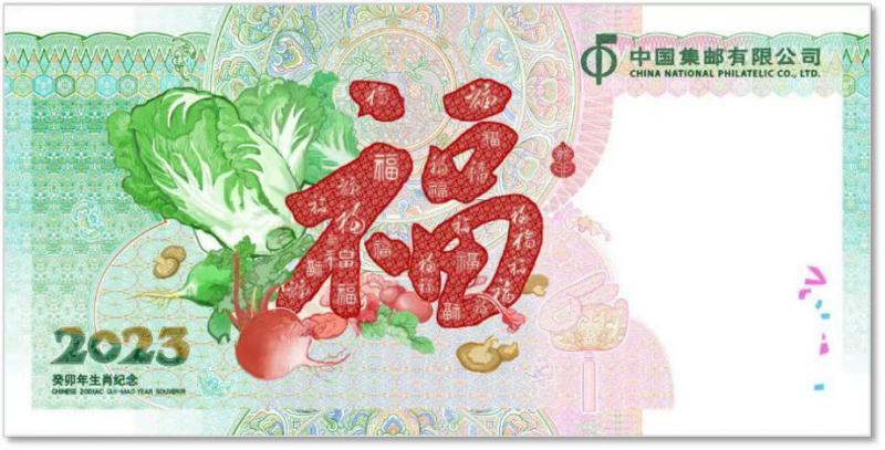 紀(jì)念券背面主景采用多個(gè)“福”字的組合,寓意著新的一年福氣連連、福滿門。背景團(tuán)花中有玉兔搗藥的圖案,表達(dá)了疫情之下祈求健康、幸福的真摯愿望。白菜、蘿卜、蘑菇也都有著各自的深意,比如白菜諧音“百財(cái)”,且有清白之意;蘿卜在閩南方言叫“菜頭”,諧音彩頭;蘑菇則象征蓬勃向上的生命力量。這些看似普通的元素給人以親切之感,更寓意著源源不斷的財(cái)運(yùn)、好運(yùn)和幸運(yùn)。