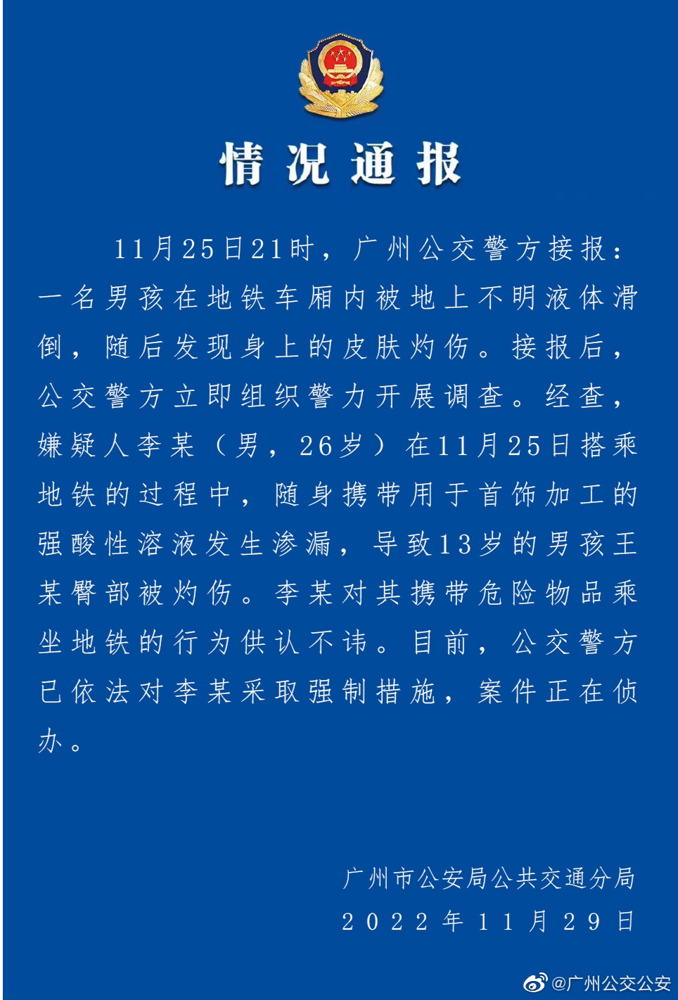 通報顯示,25日21時,廣州公交警方接報稱,一名男孩在地鐵車廂內(nèi)被地上不明液體滑倒,隨后發(fā)現(xiàn)身上的皮膚灼傷。接報后,公交警方立即組織警力開展調(diào)查。經(jīng)查,嫌疑人李某(男,26歲)在11月25日搭乘地鐵的過程中,隨身攜帶用于首飾加工的強酸性溶液發(fā)生滲漏,導(dǎo)致13歲的男孩王某臀部被灼傷。李某對其攜帶危險物品乘坐地鐵的行為供認(rèn)不諱。