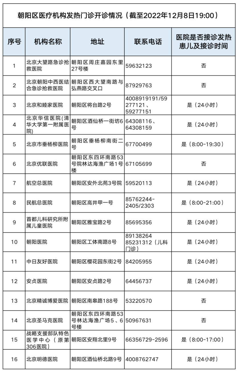 朝陽區(qū)16家發(fā)熱門診醫(yī)療機構(gòu)信息
