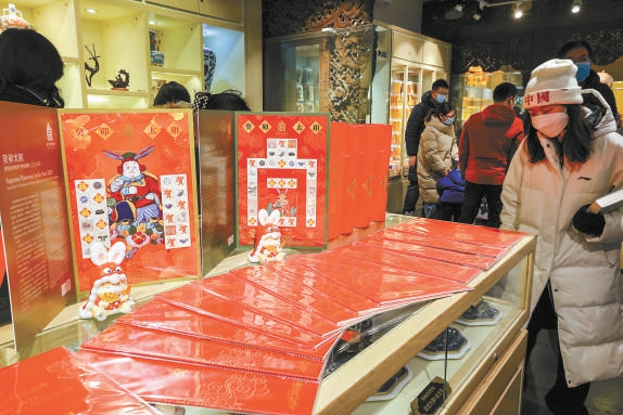 絳雪軒文創(chuàng)商店琳瑯滿目的文創(chuàng)商品中,紅彤彤的年味兒文創(chuàng)產(chǎn)品吸引眼球?!坝袛?shù)十種兔年文創(chuàng)上新,比如傳統(tǒng)的新春福筒,堪比一個移動展覽的珍寶日歷,還有宮廷味兒十足的新春裝裱畫等。”故宮博物院文創(chuàng)事業(yè)部工作人員宋丹丹介紹,今年新推出的故宮文創(chuàng)郵票頗受關注。“乾隆屬兔,郵票特意選擇了一幅他的墨寶。這版郵票的手稿已經(jīng)被帶到了中國空間站。”
