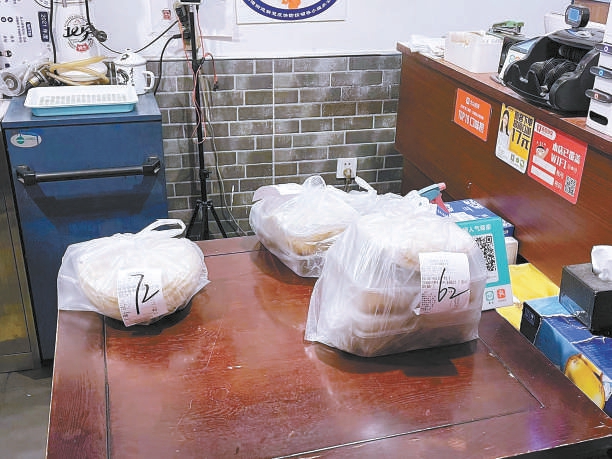 但在龍?zhí)督值酪患掖猴灥辏浾攥F(xiàn)場(chǎng)看到,春餅外賣只是被服務(wù)員套上塑料袋并簡單系了個(gè)結(jié),放到門口的桌子上等外賣員來取,沒有貼外賣封簽,更沒有有效的密封措施。