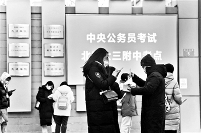 昨日早上8點,北京師范大學(xué)第三附屬中學(xué)的考點已有考生陸續(xù)到場。一些公考輔導(dǎo)機構(gòu)在考點門前派發(fā)復(fù)習(xí)資料,北京青年報記者看到,黨的二十大報告,北京冬奧會、冬殘奧會,2022年中央一號文件等時事熱點都被列為重點內(nèi)容。8點20分,考生開始入場。工作人員手持測溫儀,對每個考生進(jìn)行測溫??键c內(nèi)的一樓也設(shè)置了兩個備用考場。據(jù)悉,按照要求,有發(fā)熱(體溫≥37.3℃)等可疑癥狀的,應(yīng)服從安排在備用考場佩戴N95口罩參加考試。
