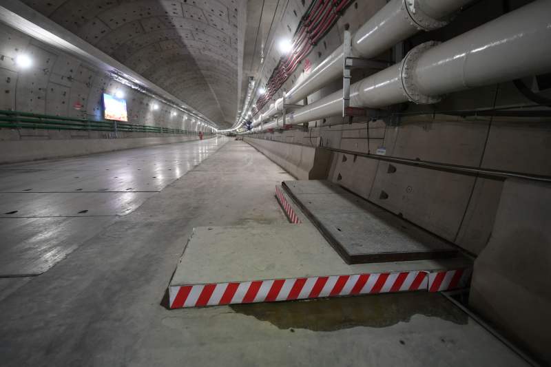 此外,箱涵兩側(cè)分別設(shè)置有管廊與人員應(yīng)急通道,而這些在路面鋪設(shè)完畢后都將藏于路面下方,對通行者來說完全是無感的。孫長松指著路面上的一處蓋有擋板的地方告訴記者,這里就是人員應(yīng)急通道的入口,通車后路面上將設(shè)置用液壓控制的智能蓋板,正常狀態(tài)下,它與路面嚴絲合縫地貼在一起,在發(fā)生意外情況、需要疏散人員時,它則會及時開啟。