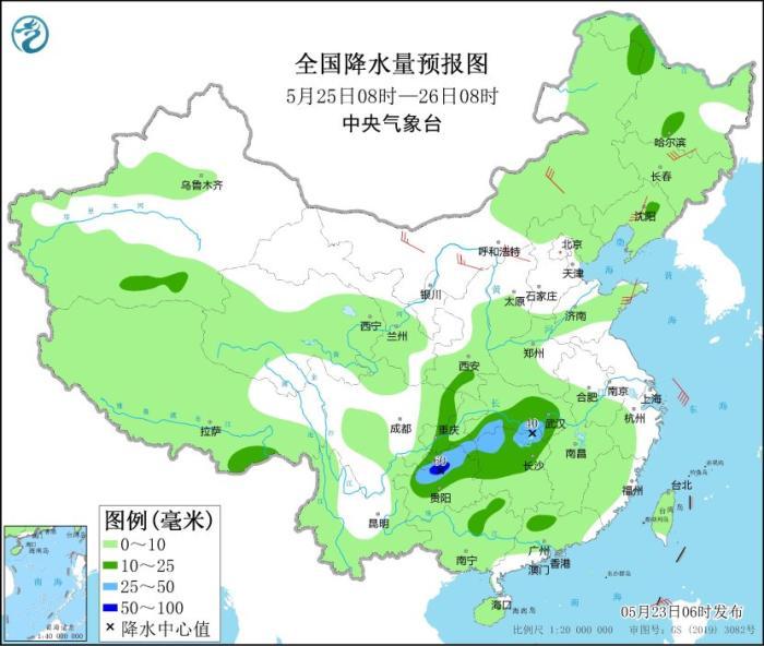 5月25日08時至26日08時,內(nèi)蒙古東北部、黑龍江南部、遼寧中北部、江漢、江南北部、西南地區(qū)東部、廣西東北部等地部分地區(qū)有中到大雨,其中,貴州北部等地部分地區(qū)有暴雨(50~60毫米)。內(nèi)蒙古、東北地區(qū)、山東半島等地的部分地區(qū)有4~6級風(fēng)。