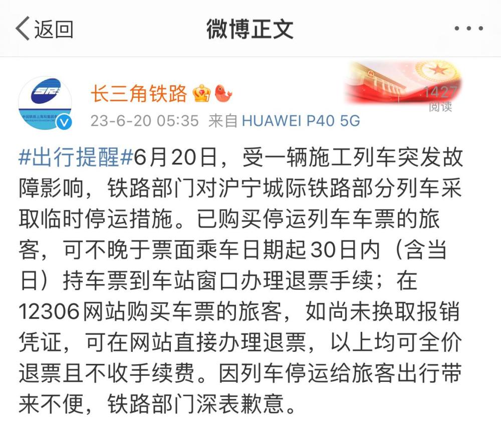 記者6月20日從鐵路上海局獲悉,受一輛施工列車突發(fā)故障影響,鐵路部門對滬寧城際鐵路部分列車采取臨時(shí)停運(yùn)措施。已購買停運(yùn)列車車票的旅客,可不晚于票面乘車日期起30日內(nèi)(含當(dāng)日)持車票到車站窗口辦理退票手續(xù);在12306網(wǎng)站購買車票的旅客,如尚未換取報(bào)銷憑證,可在網(wǎng)站直接辦理退票,以上均可全價(jià)退票且不收手續(xù)費(fèi)。