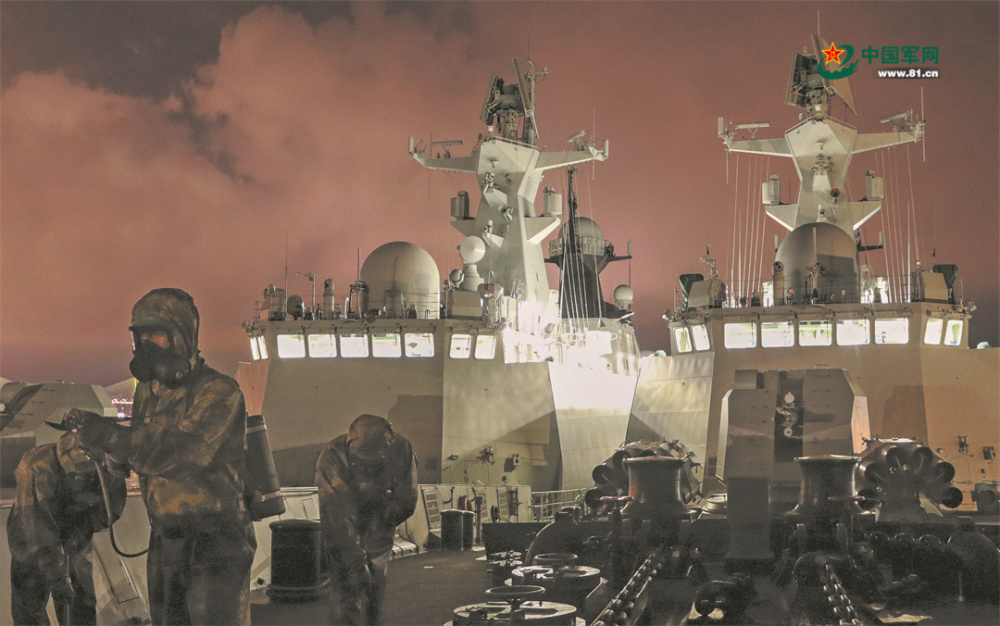 夜幕下,海軍某支隊官兵正在進(jìn)行洗消作業(yè)。王春光 攝