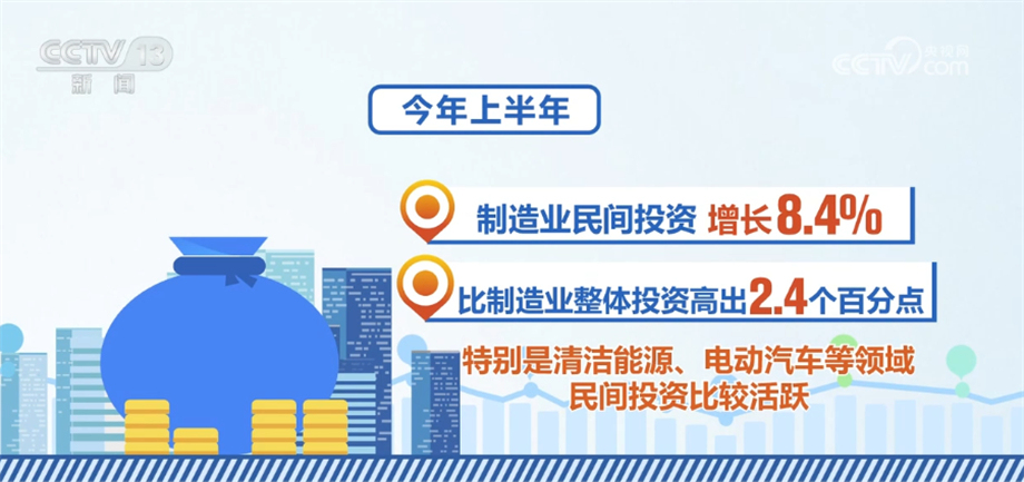 國家發(fā)展改革委相關(guān)負(fù)責(zé)人表示,當(dāng)前,民間投資結(jié)構(gòu)持續(xù)優(yōu)化,一些領(lǐng)域民間投資顯現(xiàn)了不少亮點。今年上半年,除房地產(chǎn)開發(fā)以外的民間投資同比增長9.4%,增速比全部投資高5.6個百分點;制造業(yè)民間投資增長8.4%,比制造業(yè)整體投資高出2.4個百分點,特別是清潔能源、電動汽車等領(lǐng)域民間投資比較活躍;基礎(chǔ)設(shè)施民間投資增長15.6%,比基礎(chǔ)設(shè)施整體投資高出8.4個百分點,呈現(xiàn)出較強(qiáng)的投資信心和投資動力。
