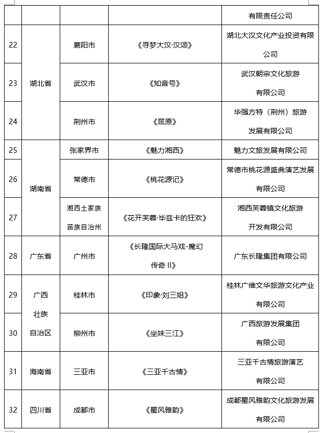 央廣網(wǎng)北京9月27日消息 據(jù)文化和旅游部網(wǎng)站消息,為堅(jiān)持以文塑旅、以旅彰文,推進(jìn)文化產(chǎn)業(yè)和旅游產(chǎn)業(yè)深度融合發(fā)展,根據(jù)《文化和旅游部產(chǎn)業(yè)發(fā)展司關(guān)于開(kāi)展全國(guó)旅游演藝精品名錄申報(bào)工作的通知》部署,在各省級(jí)文化和旅游行政部門(mén)推薦申報(bào)基礎(chǔ)上,經(jīng)專(zhuān)家評(píng)審和綜合研究,文化和旅游部產(chǎn)業(yè)發(fā)展司確定了全國(guó)旅游演藝精品名錄入選項(xiàng)目名單,現(xiàn)予以公布。