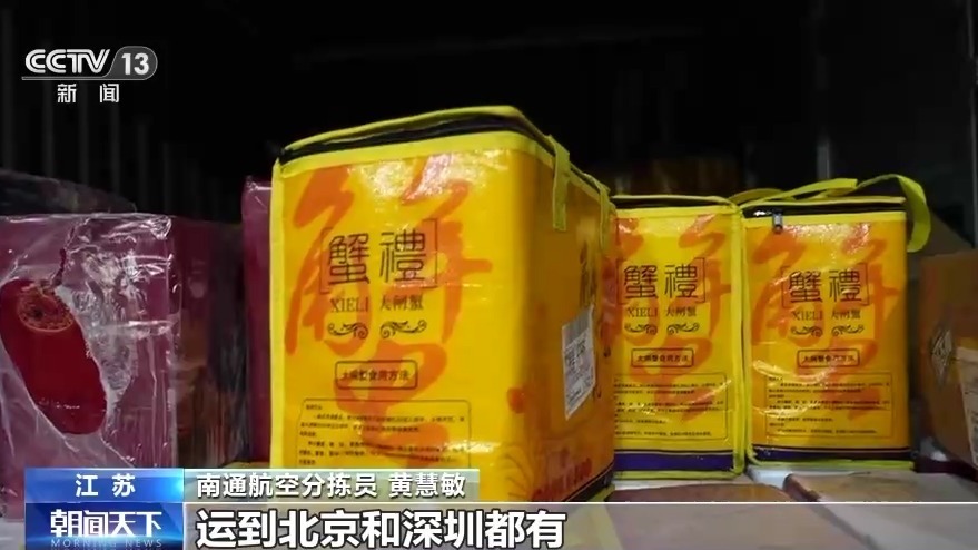 南通航空分揀員 黃慧敏:這批是來的鎮(zhèn)江郭莊來的大閘蟹,已經(jīng)開始分揀了,運(yùn)到北京和深圳都有。