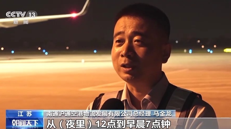 南通滬通空港物流發(fā)展有限公司總經(jīng)理 馬金龍:從夜里12點(diǎn)到早晨7點(diǎn)鐘,陸續(xù)有8個(gè)航班離港,目的站主要是廣州、深圳、北京幾個(gè)機(jī)場。