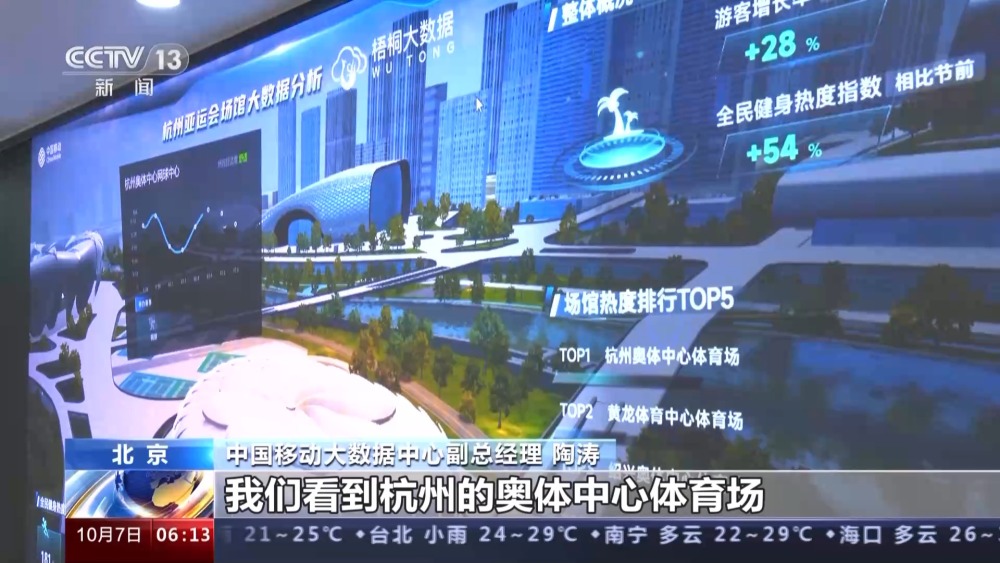 中國移動大數(shù)據(jù)中心副總經(jīng)理 陶濤:前往亞運(yùn)會主要舉辦城市的游客的數(shù)量相比節(jié)前一周日均增幅超過28%,主要是來自長三角地區(qū)以及津京冀等地區(qū)。根據(jù)我們對于線上訂票以及搜索這些數(shù)據(jù)的分析,我們看到杭州的奧體中心體育場、黃龍?bào)w育中心體育場以及紹興奧體中心體育館這三個(gè)場館是最熱的體育場館。