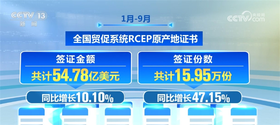 1月—9月,全國(guó)貿(mào)促系統(tǒng)RCEP原產(chǎn)地證書(shū)簽證金額共計(jì)54.78億美元,同比增長(zhǎng)10.10%;簽證份數(shù)共計(jì)15.95萬(wàn)份,同比增長(zhǎng)47.15%。