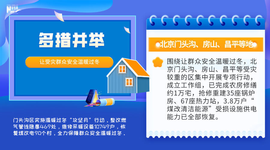 圍繞讓群眾安全溫暖過冬,北京門頭溝、房山、昌平等受災較重的區(qū)集中開展專項行動,成立工作組,已完成農房修繕約1萬宅,搶修重建35座鍋爐房、67座熱力站,3.8萬戶“煤改清潔能源”受損設施供電能力已全部恢復。