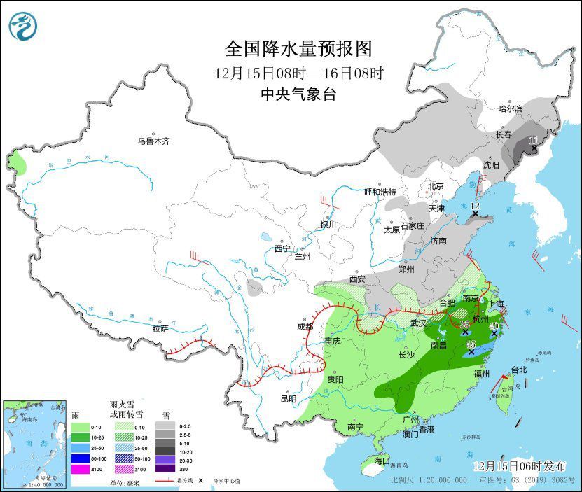 12月15日08時(shí)至16日08時(shí),西北地區(qū)東南部、內(nèi)蒙古東部、東北地區(qū)中東部和南部、黃淮、江淮大部、江漢等地部分地區(qū)有小雪或雨夾雪,其中,吉林東部、遼寧東北部、山東北部等地部分地區(qū)有中到大雪,局地暴雪(10~12毫米)。江南、西南地區(qū)東部、華南、臺(tái)灣島等地部分地區(qū)有小到中雨,其中,江西北部、浙江中南部、福建北部等地部分地區(qū)有大雨(25~45毫米)。內(nèi)蒙古西南部、遼東半島、江蘇北部等地部分地區(qū)有4~6級(jí)風(fēng),其中,青海南部部分地區(qū)有6~7級(jí)風(fēng)。