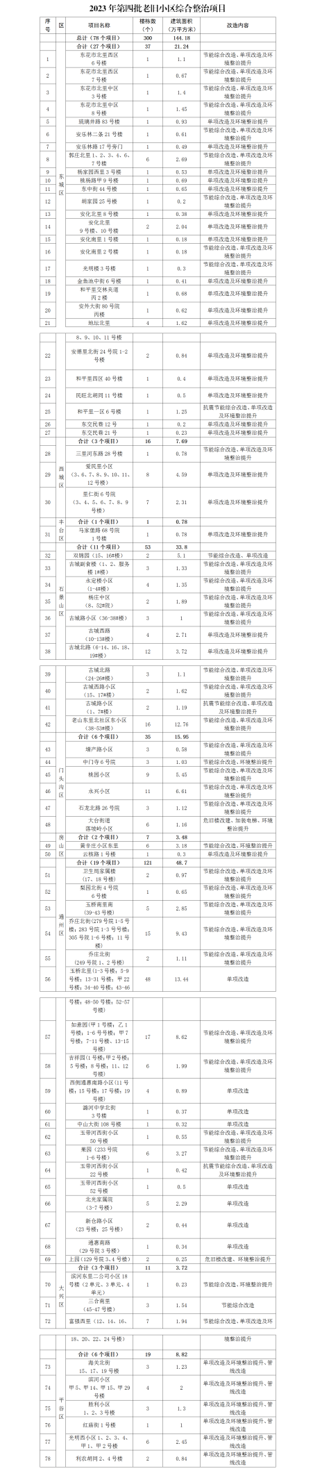 今年北京市第四批老舊小區(qū)綜合整治項(xiàng)目涉及東城、西城、豐臺、石景山、門頭溝、大興、房山、通州、平谷9個(gè)區(qū),各項(xiàng)目改造內(nèi)容根據(jù)小區(qū)居民改造意愿確定,主要包括危舊樓改建、抗震節(jié)能綜合改造、節(jié)能綜合改造、單項(xiàng)改造及環(huán)境整治提升等方面。