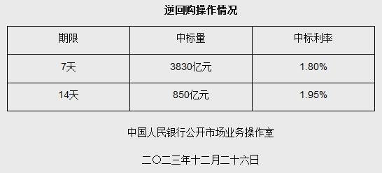 中新網(wǎng)12月26日電 據(jù)央行網(wǎng)站消息,為維護年末流動性合理充裕,2023年12月26日人民銀行以利率招標方式開展了4680億元7天期和14天期逆回購操作。具體情況如下: