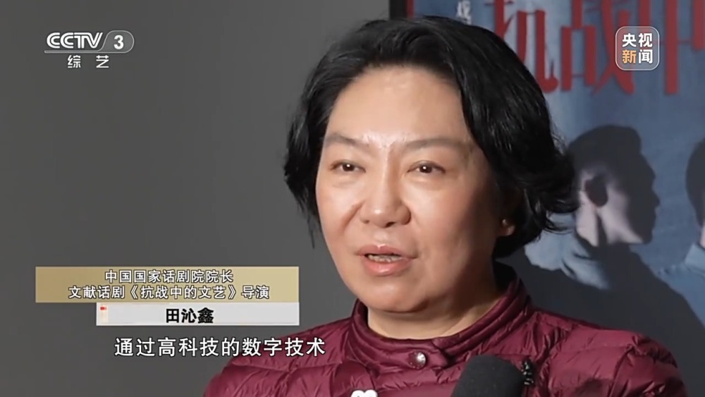 中國國家話劇院院長 文獻話劇《抗戰(zhàn)中的文藝》導(dǎo)演 田沁鑫:在舞臺方面,也是打破了時空的界限,通過高科技的數(shù)字技術(shù),影視化的多機位多角度的拍攝手法,將裝置影像藝術(shù)和戲劇表演藝術(shù)相融合,以戲劇電影的方式講好中國故事。