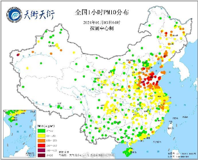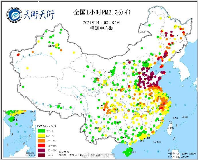 據(jù)中國(guó)氣象局氣象探測(cè)中心綜合觀測(cè)產(chǎn)品系統(tǒng)(天衡天衍)產(chǎn)品顯示,根據(jù)1月3日04時(shí)全國(guó)時(shí)均PM10、PM2.5分布圖,河北、山東、長(zhǎng)三角、川渝等地區(qū)PM10、PM2.5濃度較高。最大PM10出現(xiàn)在山東青島站,為285微克/立方米。最大PM2.5出現(xiàn)在山東淄博站,為272.6微克/立方米。以上地區(qū)PM10大都超過(guò)150微克/立方米;PM2.5大都超過(guò)115微克/立方米。