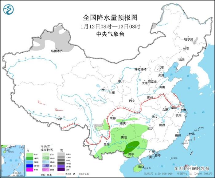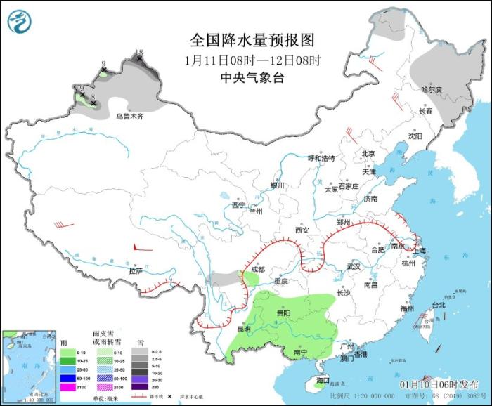 1月11日08時(shí)至12日08時(shí),內(nèi)蒙古東北部、黑龍江大部、吉林東部、新疆北部、川西高原南部等地部分地區(qū)有小到中雪或雨夾雪,其中,新疆北部塔城、阿勒泰地區(qū)和伊犁河谷等地局地有大到暴雪(10~18毫米)。貴州中南部、云南東部、廣西、湖南西南部、海南島中部等地部分地區(qū)有小雨。內(nèi)蒙古中東部、河北北部等地部分地區(qū)有5~6級(jí)風(fēng);黃海中北部、臺(tái)灣海峽、巴士海峽、南海東北部和西南部等海域有6~7級(jí)風(fēng)、陣風(fēng)8級(jí)。