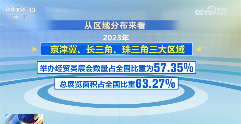 從區(qū)域分布來看,2023年京津冀、長(zhǎng)三角、珠三角三大區(qū)域舉辦經(jīng)貿(mào)類展會(huì)數(shù)量占全國(guó)比重為57.35%,總展覽面積占全國(guó)比重63.27%。