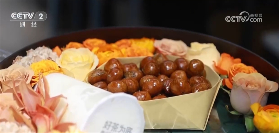 一些商家也是緊跟潮流,順勢推出“入冬四件套”禮盒。這家花店把鮮花、奶茶、糖葫蘆、糖炒栗子組合起來售賣,受到許多消費者的歡迎。