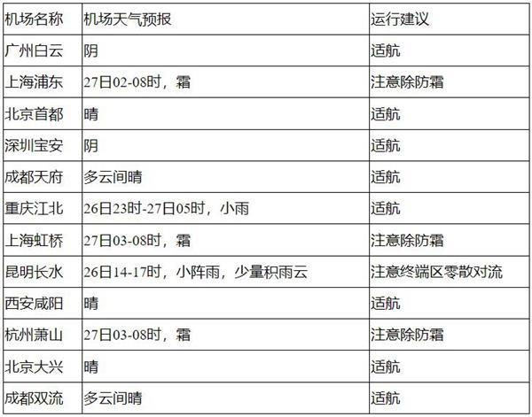 26日中午至27日中午,全國(guó)大部機(jī)場(chǎng)適航,27日凌晨至早間,哈爾濱、長(zhǎng)春、沈陽、青島、南京、合肥、虹橋、浦東、杭州等機(jī)場(chǎng)有霜;另外,26日午后,云南中南部航路有分散對(duì)流。