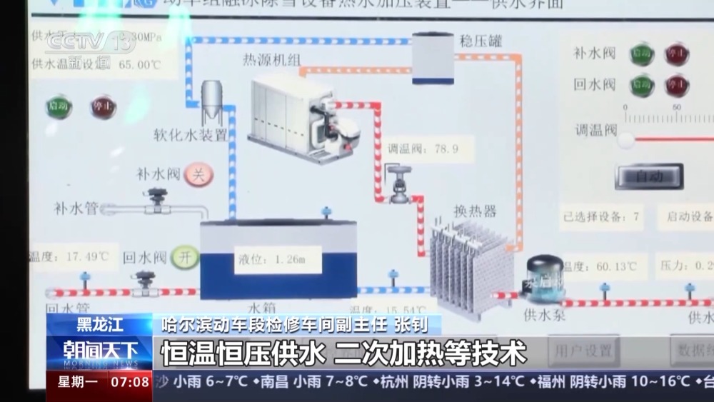 哈爾濱動車段檢修車間副主任 張釗:設(shè)備的迭代主要體現(xiàn)在集中適時加熱、恒溫恒壓供水、二次加熱等技術(shù),能夠滿足整列動車組清冰除雪需求。