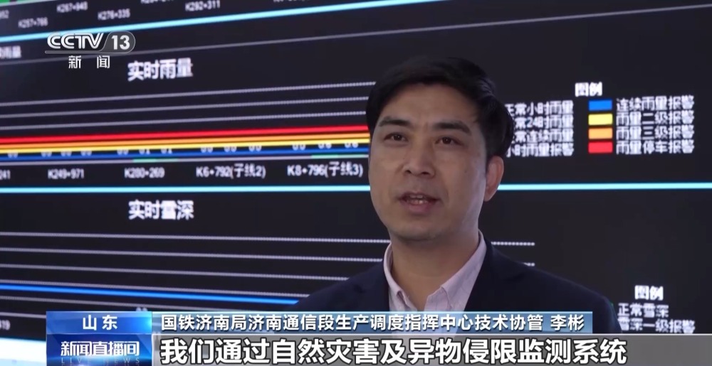 國(guó)鐵濟(jì)南局濟(jì)南通信段生產(chǎn)調(diào)度指揮中心技術(shù)協(xié)管 李彬:我們通過(guò)自然災(zāi)害及異物侵限監(jiān)測(cè)系統(tǒng),對(duì)轄區(qū)內(nèi)6000多公里鐵路線(xiàn)路、天氣、路況進(jìn)行分析。當(dāng)監(jiān)測(cè)點(diǎn)每小時(shí)降水量超過(guò)20毫米或瞬時(shí)風(fēng)力達(dá)到15米每秒、累計(jì)雪深超過(guò)50毫米時(shí),系統(tǒng)會(huì)自動(dòng)發(fā)出告警信息,指導(dǎo)列車(chē)限速、降速運(yùn)行。