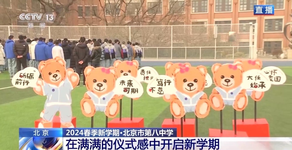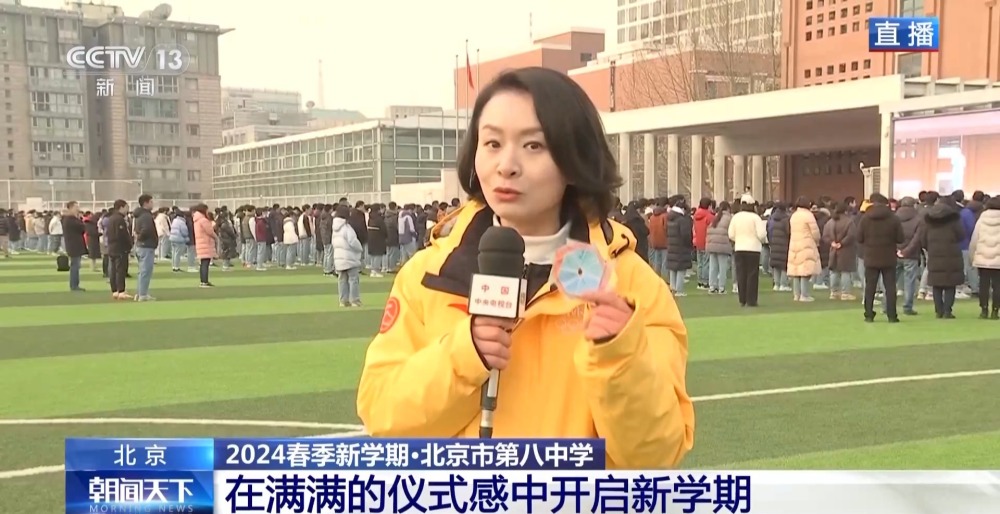 總臺央視記者 李晶晶:北京市第八中學(xué)高中部,近2300名高中生齊聚國旗下,舉行新學(xué)期的第一次升旗儀式,在滿滿的儀式感中開啟新的學(xué)習(xí)生活。今年是龍年,有句祝福語叫“龍行龘龘,前程朤朤”,現(xiàn)在正在進(jìn)行的國旗下的演講,題目就是《龘龘朤朤間是向上的力量》,老師祝福學(xué)生們像龍一樣騰飛而上,同時(shí)也是鼓勵(lì)他們要有夢想,為實(shí)現(xiàn)夢想不斷努力向上。