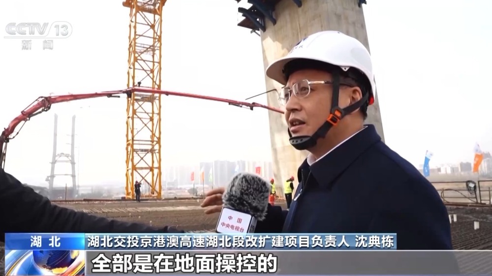 湖北交投京港澳高速湖北段改擴建項目負責人 沈典棟:這個塔頂上就是輕型智能筑塔機,是采用智能建造的技術,全都是在地面操控的,塔上無人,這樣就保證了我們工人安全。我們這個智能的布料系統(tǒng),布料很均勻,讓混凝土不產(chǎn)生離析。